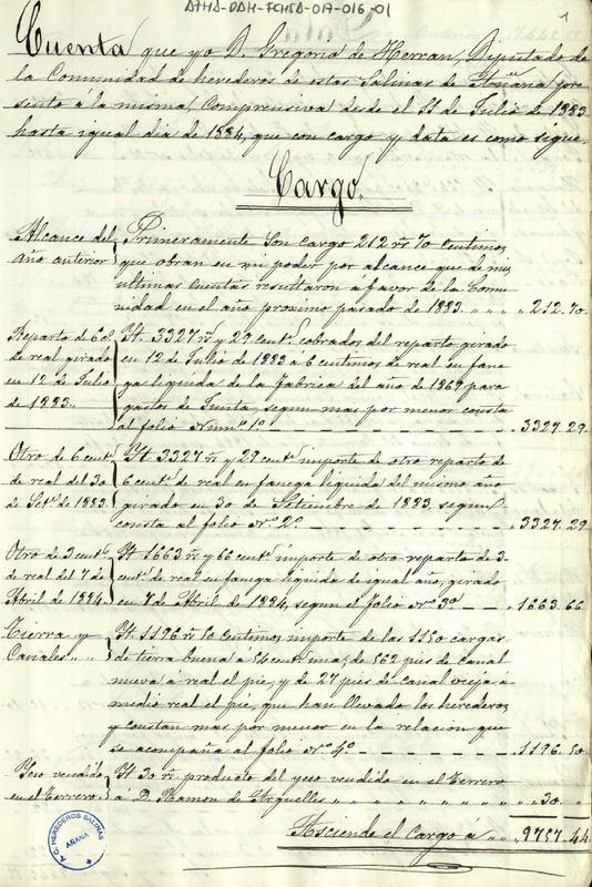 Cuenta de cargo y data de la Comunidad de Herederos de las salinas de Añana desde el 11 de julio de 1883 hasta igual día de 1884