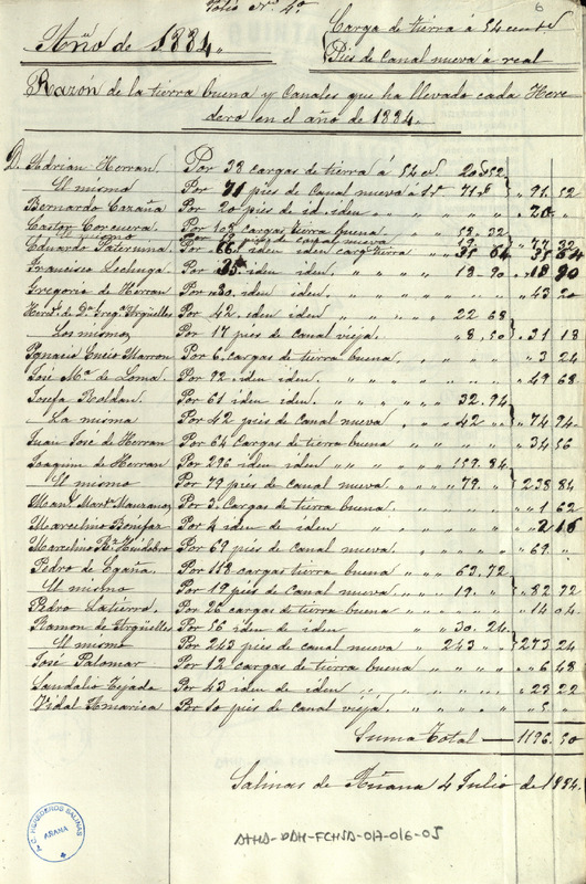 Cuenta de los gastos realizados por los Herederos de las salinas de Añana en tierra buena y pies de canal en 1884, ascendiendo el total a 1.196,50 reales