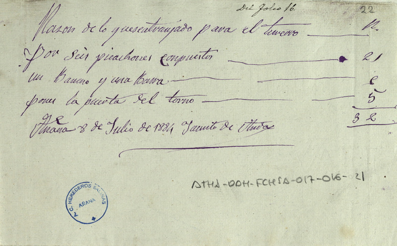 Recibo de 32 reales otorgado por Jacinto de Anda, por seis picachones y otros trabajos en el Terrero de Salinas de Añana