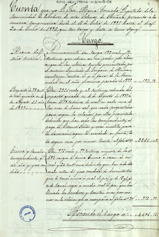Cuenta otorgada por el Diputado de la Comunidad de Herederos de las salinas de Añana José María Cruzado, desde el 11 de julio de 1885 hasta el mismo día de 1886, resultando un alcance a favor de la expresada Comunidad de 10,57 reales