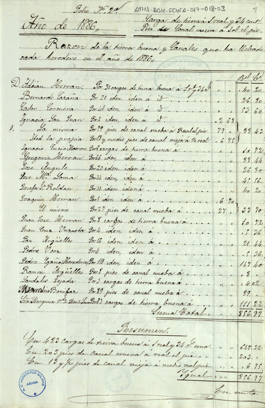 Cuenta de los gastos realizados por los Herederos de las salinas de Añana en tierra buena y pies de canal en 1886, ascendiendo el total a 856,97 reales