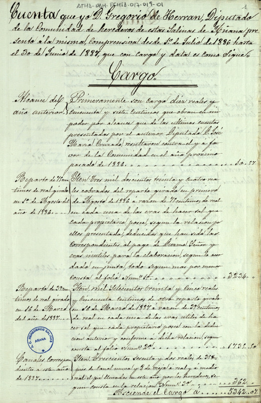 Cuenta otorgada por el Diputado de la Comunidad de Herederos de las salinas de Añana Gregorio de Herrán, desde el 1 de julio de 1886 hasta el 30 de junio de 1887, resultando un alcance a favor de la expresada Comunidad de 16,57 reales