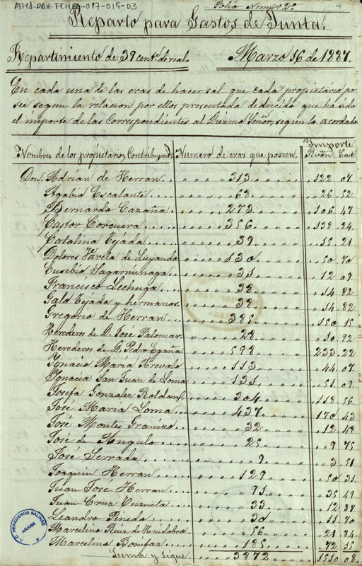 Lista del repartimiento de 39 céntimos de real en cada era de hacer sal, entre los Herederos Comunidad de las salinas de Añana, para el pago de los gastos de Junta de 1887