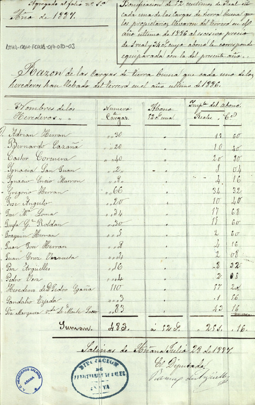 Cuenta de los gastos realizados por los Herederos de las salinas de Añana en cargas de tierra buena durante 1887