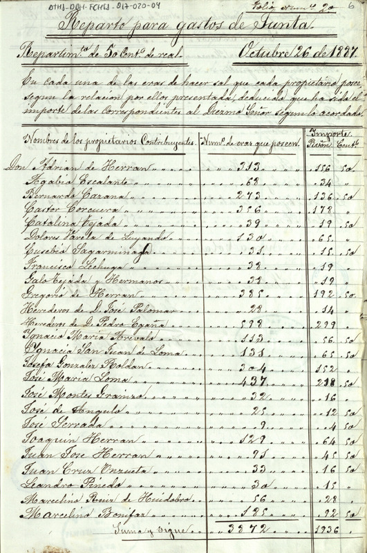 Lista del repartimiento de 50 céntimos de real en cada era de hacer sal, entre los Herederos de la Comunidad de las salinas de Añana, formada por su Diputado Ramón de Argüelles para el pago de los gastos de Junta de 1887, ascendiendo a un total de 2.250 reales