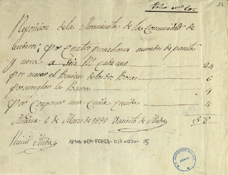 Recibo de 38 reales otorgado por Jacinto de Anda, por el suministro de cuatro picachones y otros trabajos para la Comunidad de Herederos de las salinas de Añana