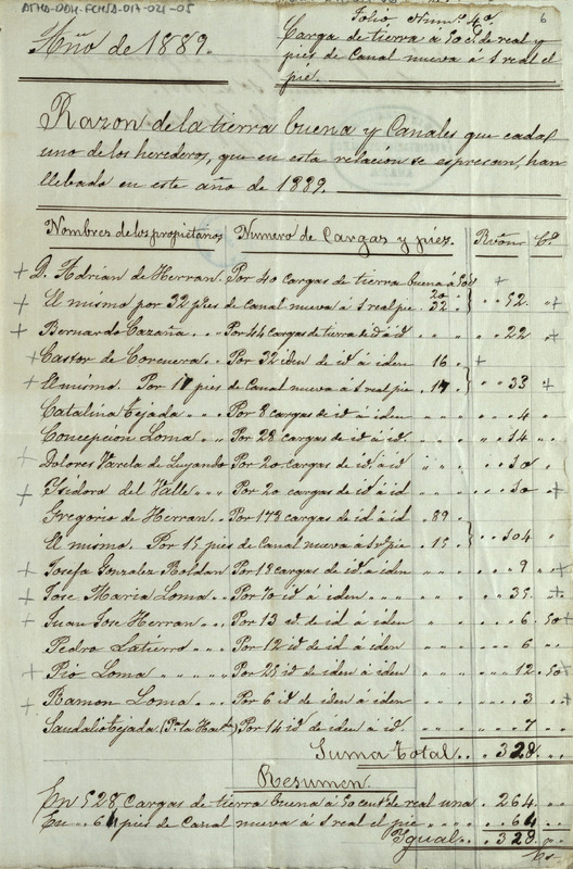 Cuenta de los gastos realizados por los Herederos de las salinas de Añana en cargas de tierra buena y pies de canal en 1889, realizada por su Diputado, Agustín Ruiz de Osma, ascendiendo a un total de 328