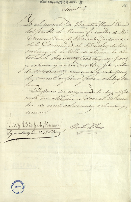 Recibo de 236,75 pesetas otorgado por Benito Alonso, vecino de Barrio, en favor de Ramón Ruiz de Huidobro como Diputado de la Comunidad de Herederos de las salinas de Añana, por el suministro de 947 pies de canal para la expresada Comunidad