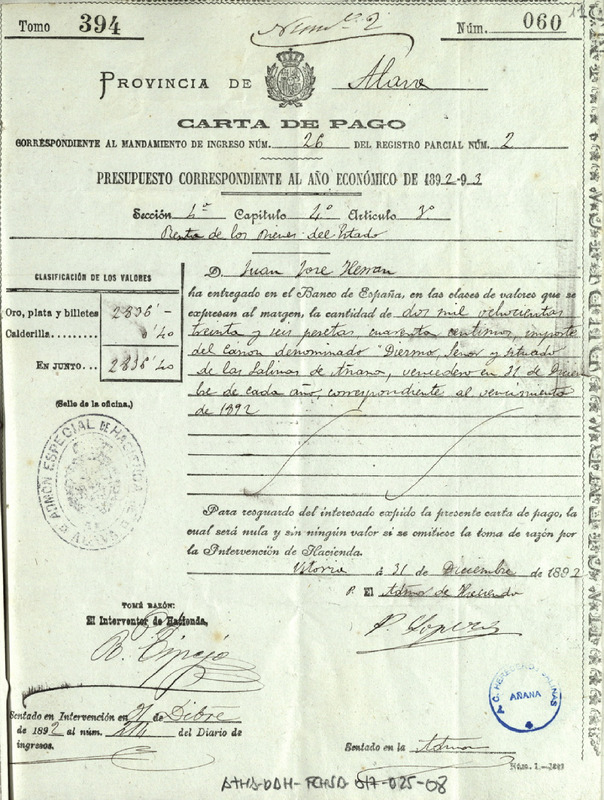 Recibo de 2.836,40 pesetas otorgado por el Administrador de Hacienda de Álava, en favor de Juan José de Herrán en nombre de la Comunidad de Herederos de las salinas de Añana, por el canon del Diezmo Señor y Situado correspondiente al año de 1892