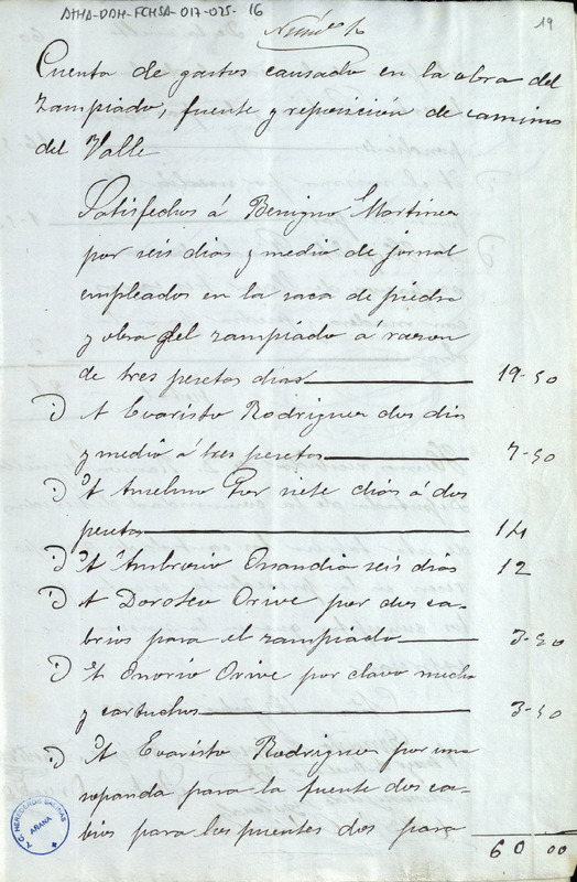 Recibo de 81 pesetas otorgado por Benigno Martínez, Evaristo Rodríguez, Ambrosio Onandía, Dorotea Orive, Honorio Orive e Hipólito Pinedo, en favor de Ramón Argüelles como Diputado de la Comunidad de Herederos de las salinas de Añana, por los gastos causados en la obra del zampeado, fuente y reposición de camino en el Valle Salado de Añana