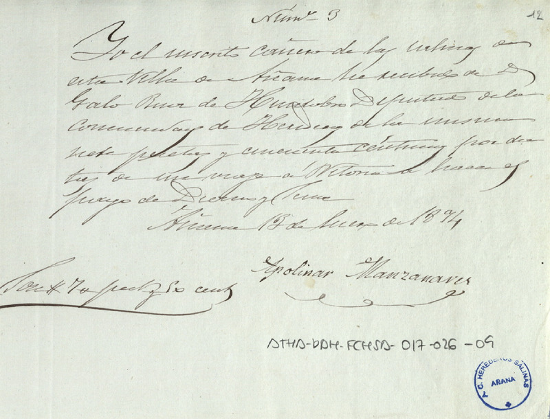 Recibo de 7,50 pesetas otorgado por Apolinar Manzanares, en favor de Galo Ruiz de Huidobro como Diputado de la Comunidad de Herederos de las salinas de Añana, por la dieta generada en el viaje a Vitoria para el pago del canon del Diezmo Señor
