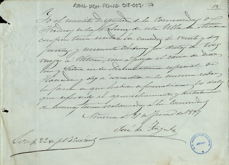 Recibo de 22,50 pesetas otorgado por José de Angulo como Diputado de la Comunidad de Herederos de las salinas de Añana, en favor de la expresdaa Comunidad, por la dieta correspondiente a un viaje realizado a Vitoria para el pago del Diezmo Señor de 1896