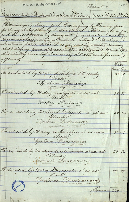 Nómina formada por la Comunidad de Herederos de las salinas de Añana correspondiente al guarda cañero del Valle Salado, Apolinar Manzanares, del año económico de 1900-01 con sus recibos mensuales, ascendiendo a un total de 456,25 pesetas