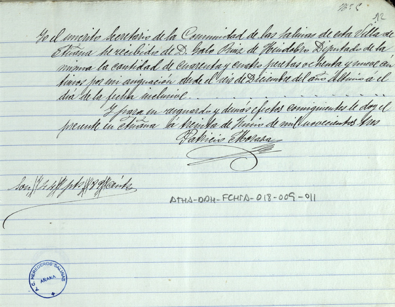Recibo de 44,89 pesetas otorgado porPatricio Moraza, en favor de Galo Ruiz de Huidobro como Diputado de la Comunidad de Herederos de las salinas de Añana, por su asignación como secretario de la expresada Comunidad desde el 6 de diciembre de 1902 hasta el día de la fecha