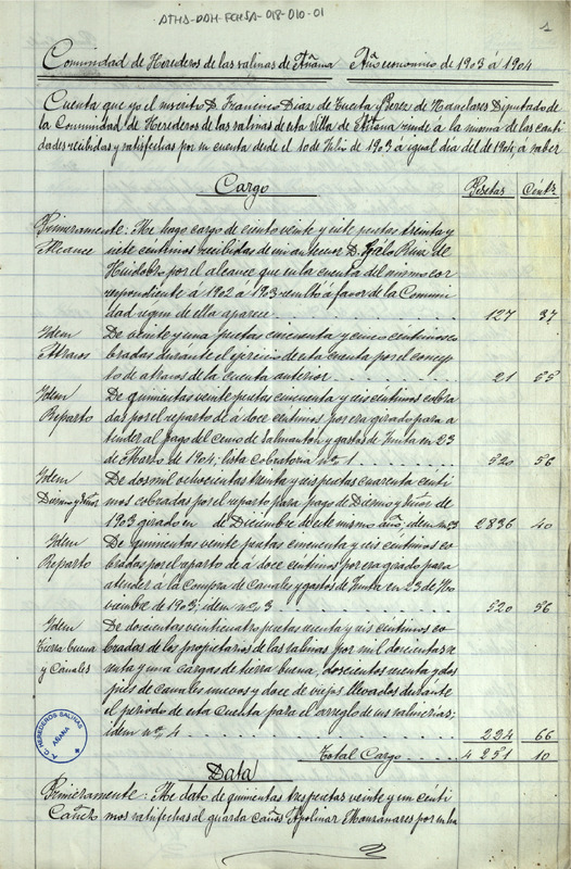 Cuenta de cargo y data de la Comunidad de Herederos de las salinas de Añana desde el 10 de julio de 1903 hasta el igual día de 1904