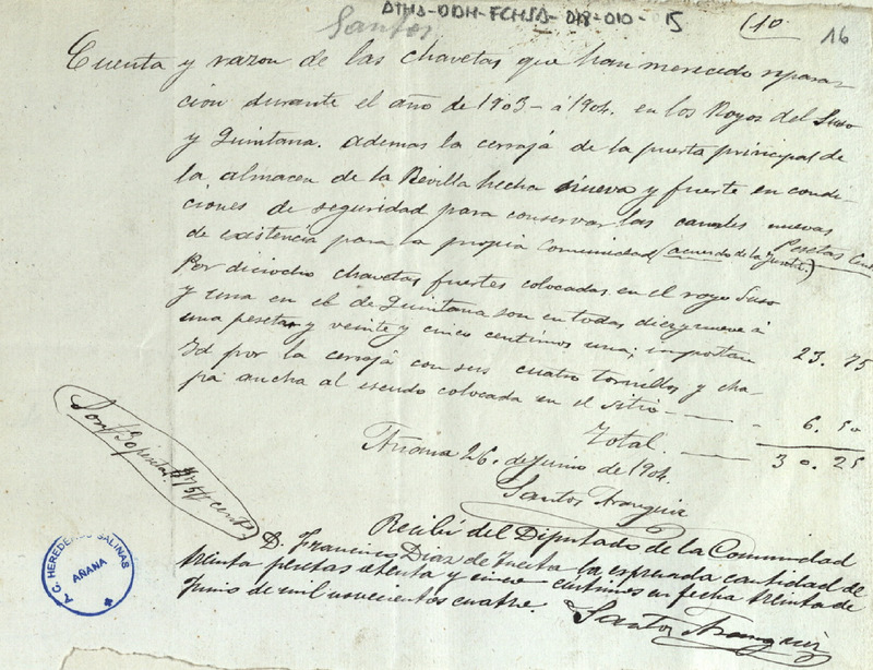 Recibo de 30,75 pesetas otorgado por Santos Aránguiz, en favor de Francisco Díaz de Tuesta como Diputado de la Comunidad de Herederos de las salinas de Añana, por el suministro y colocación de 18 de chavetas para los royos Suso y Quintana, así como una cerraja