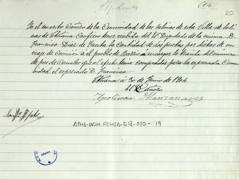 Recibo de 2 pesetas otorgado por el cañero Apolinar Manzanares, en favor de Francisco Díaz de Tuesta como Diputado de la Comunidad de Herederos de las salinas de Añana, por la dieta correspondiente a un viaje en camión a Barrio, para encargar la traída de pies de canal