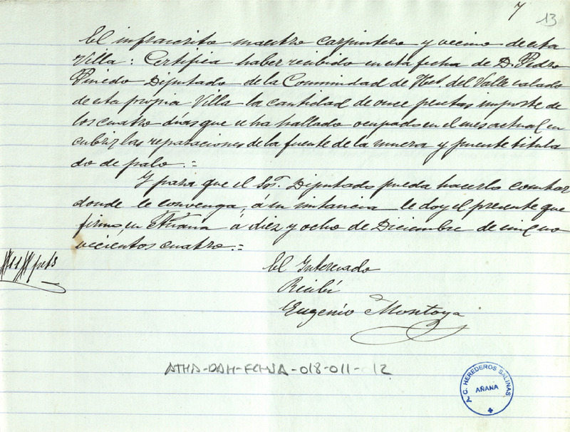 Recibo de 11 pesetas otorgado por Eugenio Montoya, en favor de Pedro Pinedo como Diputado de la Comunidad de Herederos de las salinas de Añana, por cuatro días trabajados en la reparación de la fuente de muera de Salinas de Añana y el puente titulado de Palo