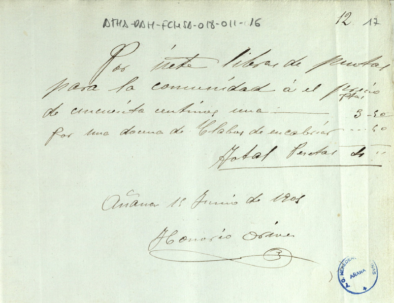 Recibo de 4 pesetas otorgado por Honorio Orive, por el suministro de siete libras de puntas y una docena de clavos para la Comunidad de Herederos de las salinas de Añana