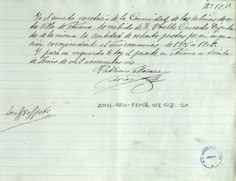 Recibo de 80 pesetas otorgado por Patricio Moraza, en favor de Ubaldo Cruzado como Diputado de la Comunidad de Herederos de las salinas de Añana, por su asignación como secretario de la expresada Comunidad correspondiente al año económico 1905-06