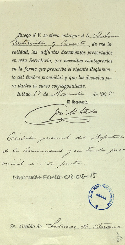 Comunicación dirigida al alcalde de Salinas de Añana para que entregasen a Antonio Estavillo los documentos que se adjuntaban