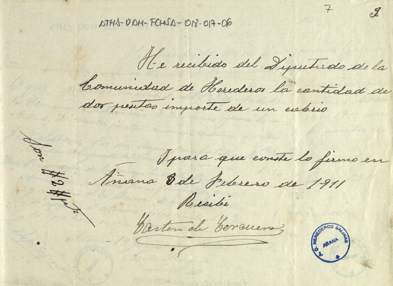 Recibo de 2 pesetas otorgado por Cástor de Corcuera, en favor del Diputado de la Comunidad de Herederos de las salinas de Añana, por el importe de un cabrio