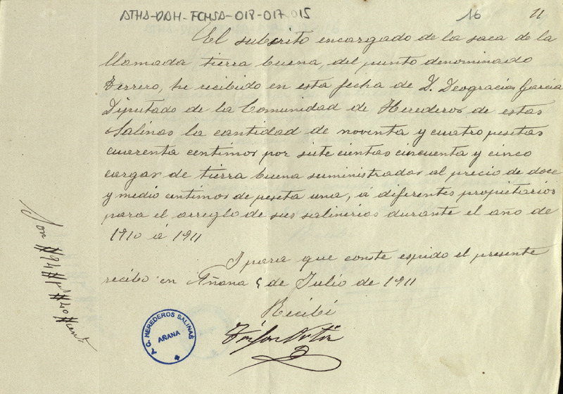 Recibo de 94,40 pesetas otorgado por el encargado de la saca de tierra buena Trifón Ortiz, en favor de Deogracias García como Diputado de la Comunidad de Herederos de las salinas de Añana, por el suministro de 755 cargas de tierra buena para la expresada Comunidad