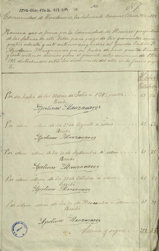 Nómina formada por la Comunidad de Herederos de las salinas de Añana correspondiente al guarda cañero de dicha villa, Apolinar Manzanares, del año económico de 1914-15 con sus recibos mensuales, ascendiendo a un total de 501,84 pesetas