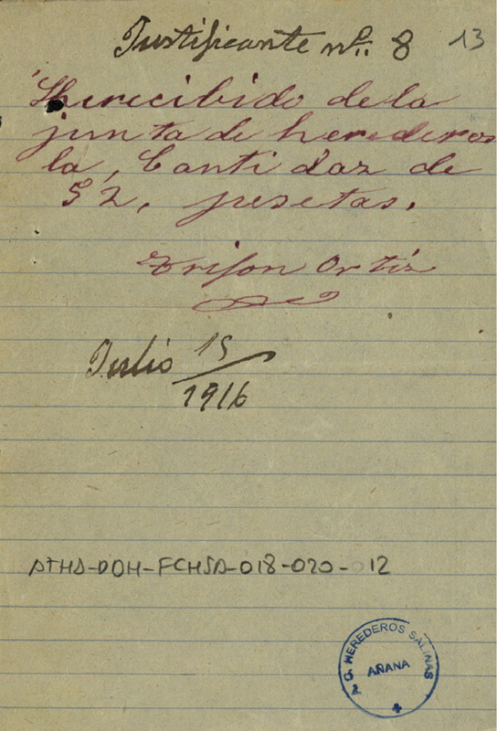 Recibo de 52 pesetas otorgado por Trifón Ortiz en favor de la Junta de Herederos de las salinas de Añana