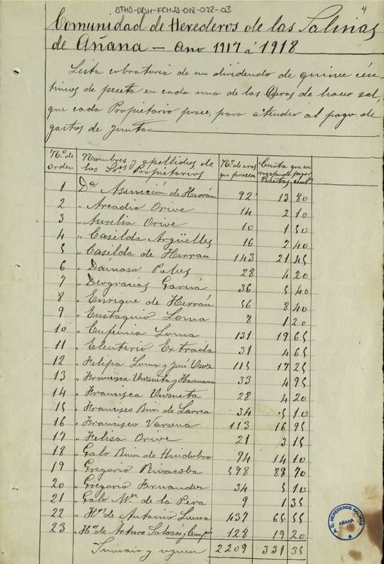 Lista cobratoria del repartimiento de 15 céntimos de peseta en cada era de hacer sal entre los Herederos de la Comunidad de las salinas de Añana, para el pago de los gastos de Junta de 1917-18