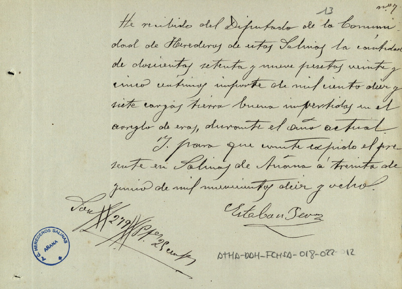 Recibo de 279,25 pesetas otorgado por Esteban Pérez por el suministro de cargas de tierra buena para la Comunidad de Herederos de las salinas de Añana en el año 1917-18