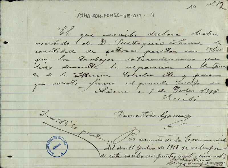 Recibo de 14,50 pesetas otorgado por Demetrio Gómez, en favor de Eustaquio Loma, por los trabajos extraordinarios realizados en la reparación de canales y fuente de muera de Salinas de Añana
