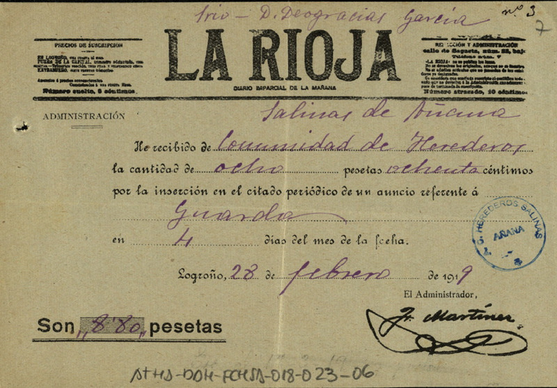 Recibo de 8,80 pesetas otorgado por el administrador del diario La Rioja, en favor de la Comunidad de Herederos de las salinas de Añana, por un anuncio puesto en dicho diario sobre la vacante del empleo de guarda cañero de Salinas de Añana