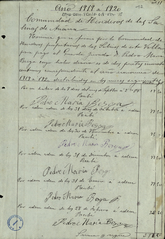 Nómina formada por la Comunidad de Herederos de las salinas de Añana correspondiente al guarda jurado Pedro María Besga, del año económico de 1920-21 con sus recibos correspondientes a los meses de septiembre de 1920 a junio de 1921, ascendiendo a un total de 702,50 pesetas
