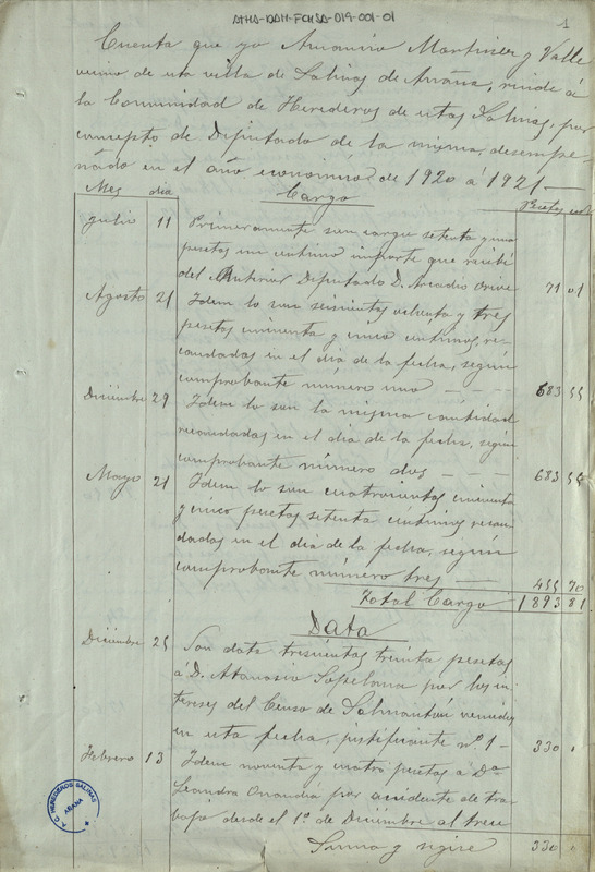 Cuenta de cargo y data otorgada por el Diputado de la Comunidad de Herederos de las salinas de Añana Amancio Martínez Valle del año económico 1920-21, resultando un alcance a favor de la expresada Comunidad de 54,47 pesetas