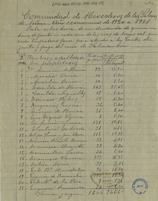 Lista cobratoria del repartimiento de 15 céntimos de peseta en cada era de hacer sal entre los Herederos de la Comunidad de las salinas de Añana, para atender a los gastos de Junta del año 1920-21 y al censo de Salmantón