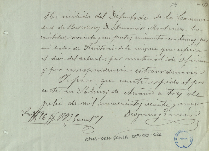 Recibo de 96,50 pesetas otorgado por Deogracias García, en favor de Amancio Martínez como Diputado de la Comunidad de Herederos de las aslinas de Añana, por su asignación y gastos suplidos como secretario de la Comunidad de Herederos de las salinas de Añana del año económico 1920-21