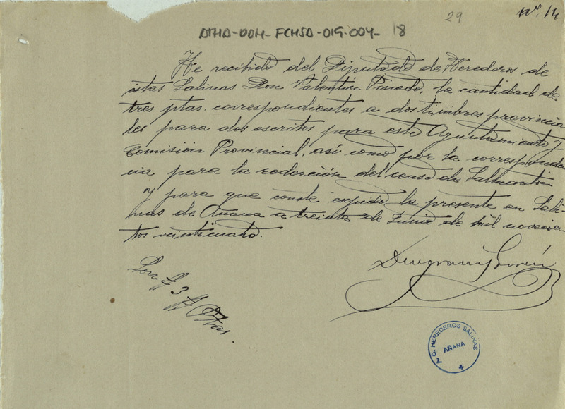 Recibo de 3 pesetas otorgado por Deogracias García, en favor de Valentín Pinedo como Diputado de la Comunidad de Herederos de las salinas de Añana, correspondientes a dos timbres provinciales para dos escritos, uno dirigido al Ayuntamiento de dicha villa y el otro para la Comisión Provincial de Álava