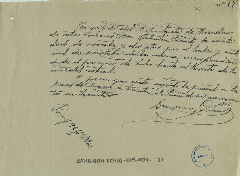 Recibo de 92 pesetas otorgado por Deogracias García, en favor de Valentín Pinedo como Diputado de la Comunidad de Herederos de las salinas de Añana, por su asignación y gastos suplidos como secretario de la expresada Comunidad durante el año económico de 1923-24