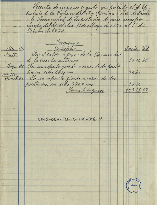 Cuenta de ingresos y gastos de la Comunidad de Herederos de las salinas de Añana desde el 11 de mayo de 1950 hasta el 1 de octubre de 1952