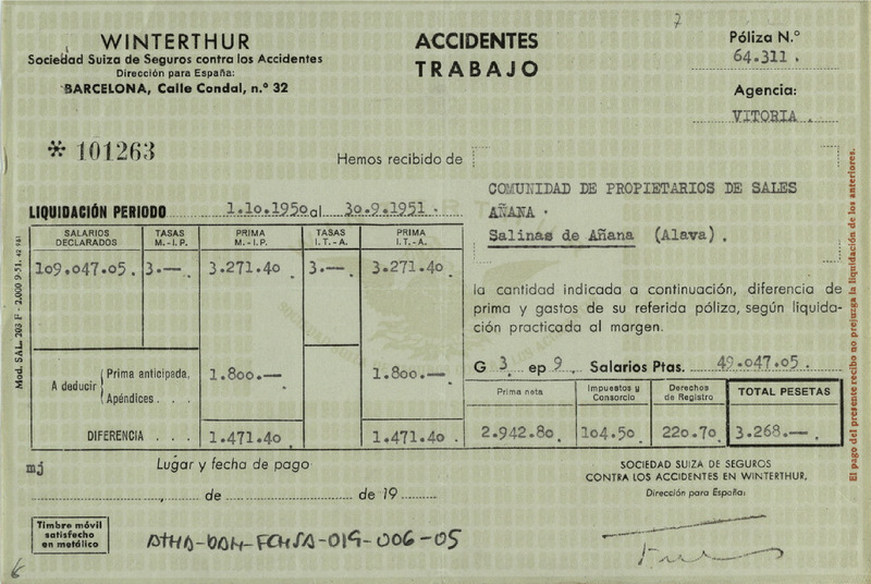 Recibo de 3.268 pesetas otorgado por los Seguros contra Accidentes Winterthur en su agencia de Vitoria, en favor de la Comunidad de Propietarios de sales de Añana, correspondientes a la liquidación del período del 1 de octubre de 1950 a 30 de septiembre de 1951