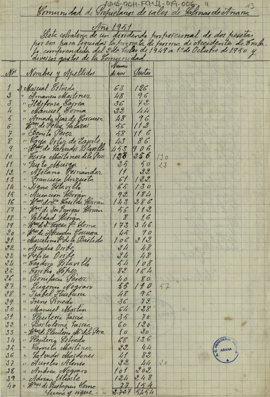 Lista cobratoria del repartimiento de 2 pesetas en cada era de hacer sal entre los Herederos de la Comunidad de las salinas de Añana para el pago de la prima de accidentes desde el 2 de julio de 1949 a 1 de octubre de 1950
