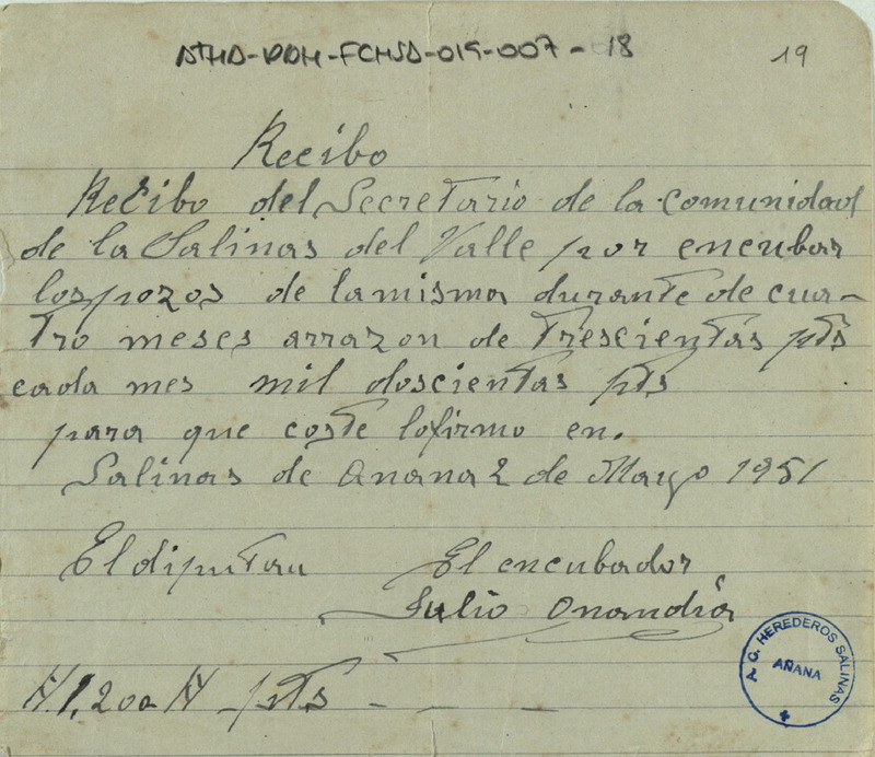 Recibo de 1.200 pesetas otorgado por el encubador Julio Onandía, en favor del secretario de la Comunidad de Herederos de las salinas de Añana, por encubar pozos de las salinas del Valle Salado de Añana