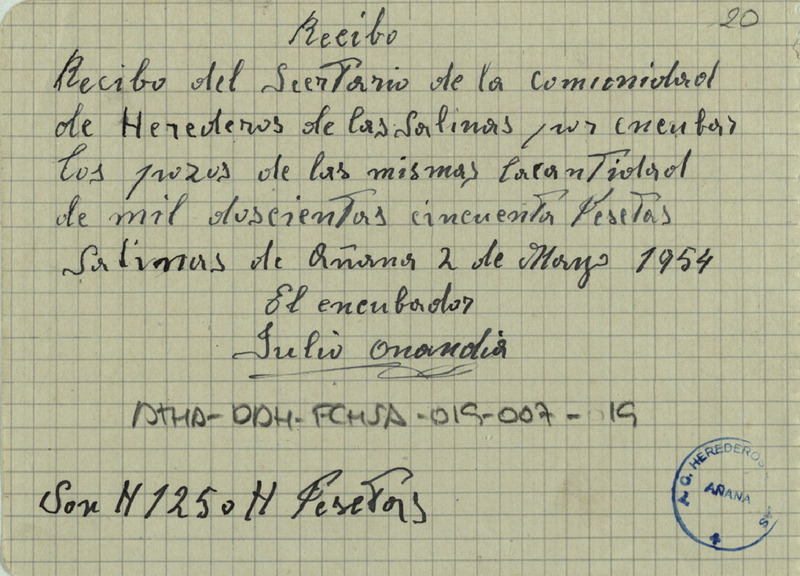 Recibo de 1.250 pesetas otorgado por el encubador Julio Onandía, en favor del secretario de la Comunidad de Herederos de las salinas de Añana, por encubar pozos de las salinas del Valle Salado de Añana durante 1954