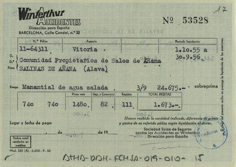 Recibo de 1.673 pesetas otorgado por Winterthur Accidentes, en favor de la Comunidad de Propietarios de sales de Salinas de Añana, por la liquidación de la póliza 64.311 del período desde el 1 de octubre de 1955 a 30 de septiembre de 1956