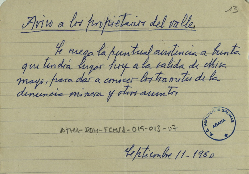 Minuta de una convocatoria a Junta a los Propietarios del Valle Salado de Añana, para la salida de misa del 11 de septiembre de 1960, para dar a conocer los trámites de la denuncia minera y otros asuntos