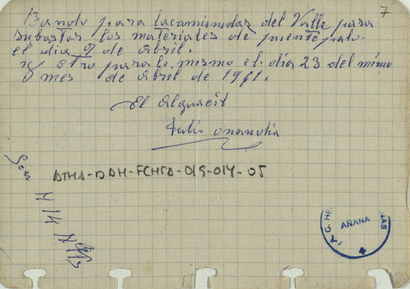 Recibo de 14 pesetas otorgado por Julio Onandía por el bando para subastar los materiales de Puente Palo en Salinas de Añana