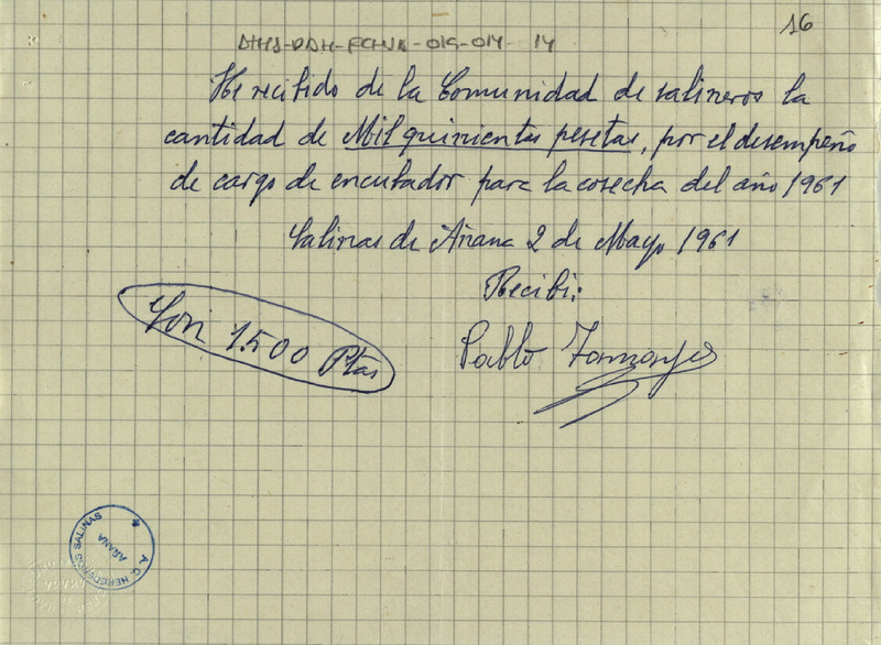 Recibo de 1.500 pesetas otorgado por Pablo Tamayo por el desempeño del cargo de encubador para la cosecha de sal de 1961 de Salinas de Añana