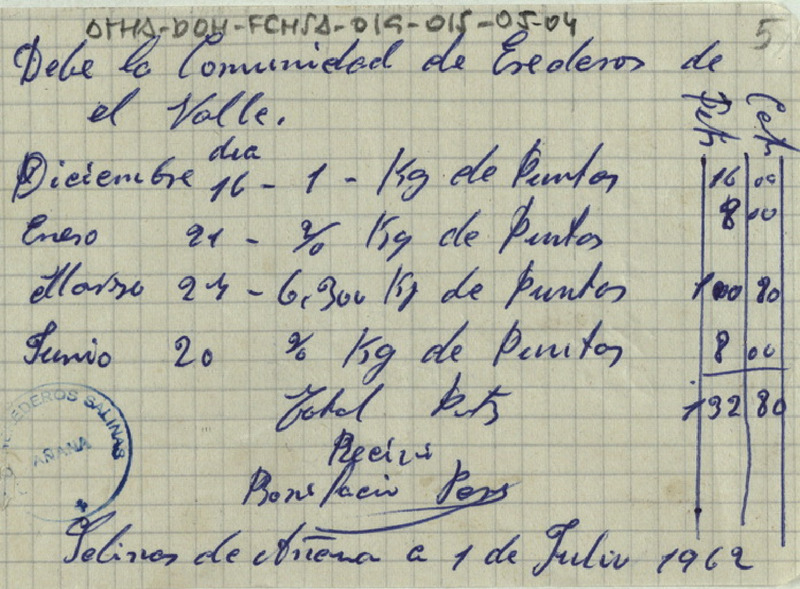 Recibo de 132,80 pesetas otorgado por Bonifacio Pérez, en favor de la Comunidad de Herederos de las salinas de Añana, por el suministro de puntas para la Comunidad durante el año 1961-62