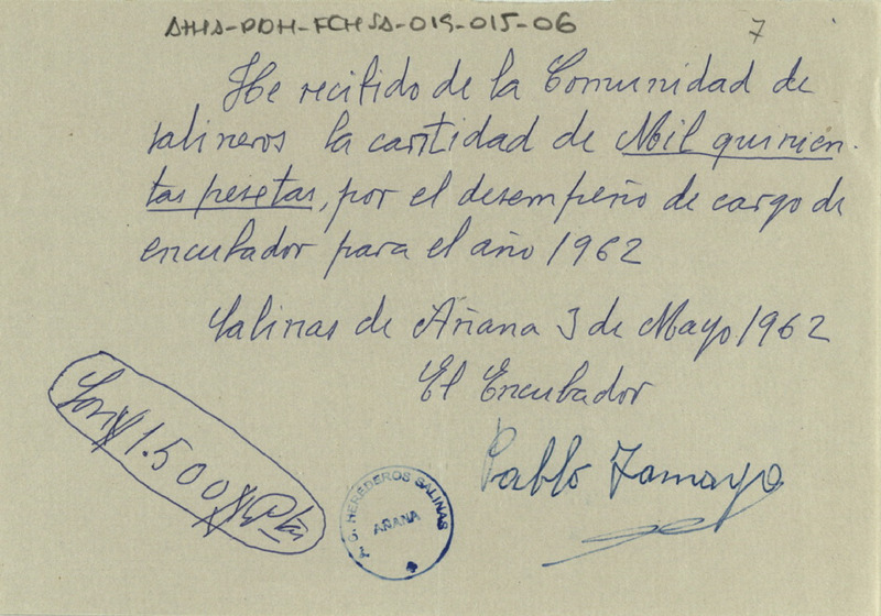 Recibo de 1.500 pesetas otorgado por Pablo Tamayo por el desempeño del cargo de encubador para la Comunidad de Herederos de las salinas de Añana del año 1962